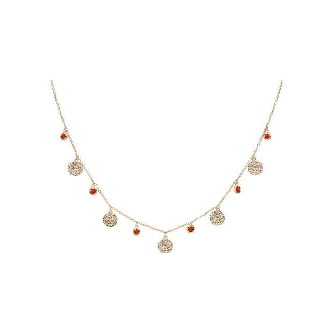 Collier plaqué or pampilles pierres synthétique couleur corail avec pastilles antiques 36+4cm