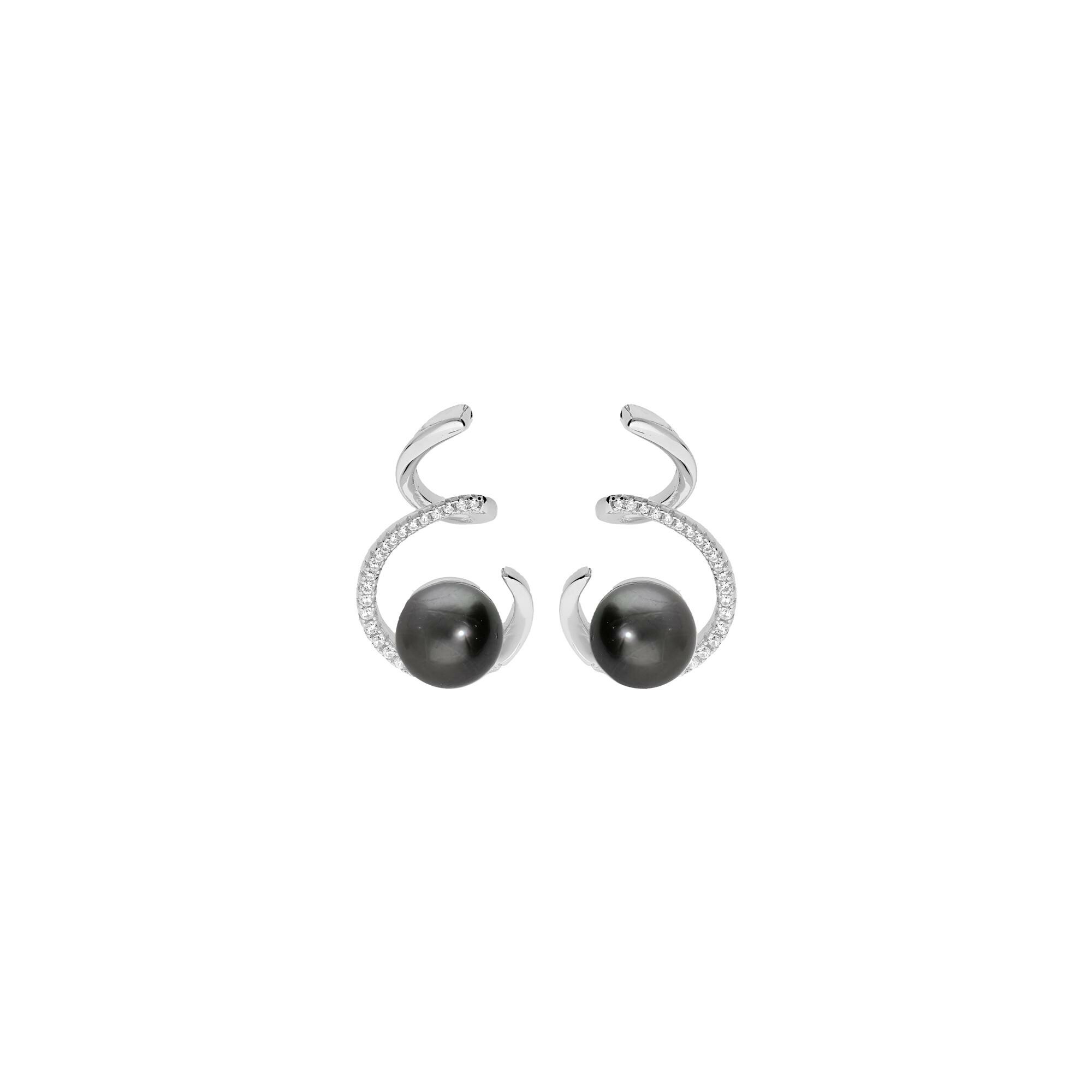 Boucles d'oreilles tige argent rhodié perle de culture de tahiti véritable 7mm et oxydes blancs sertis