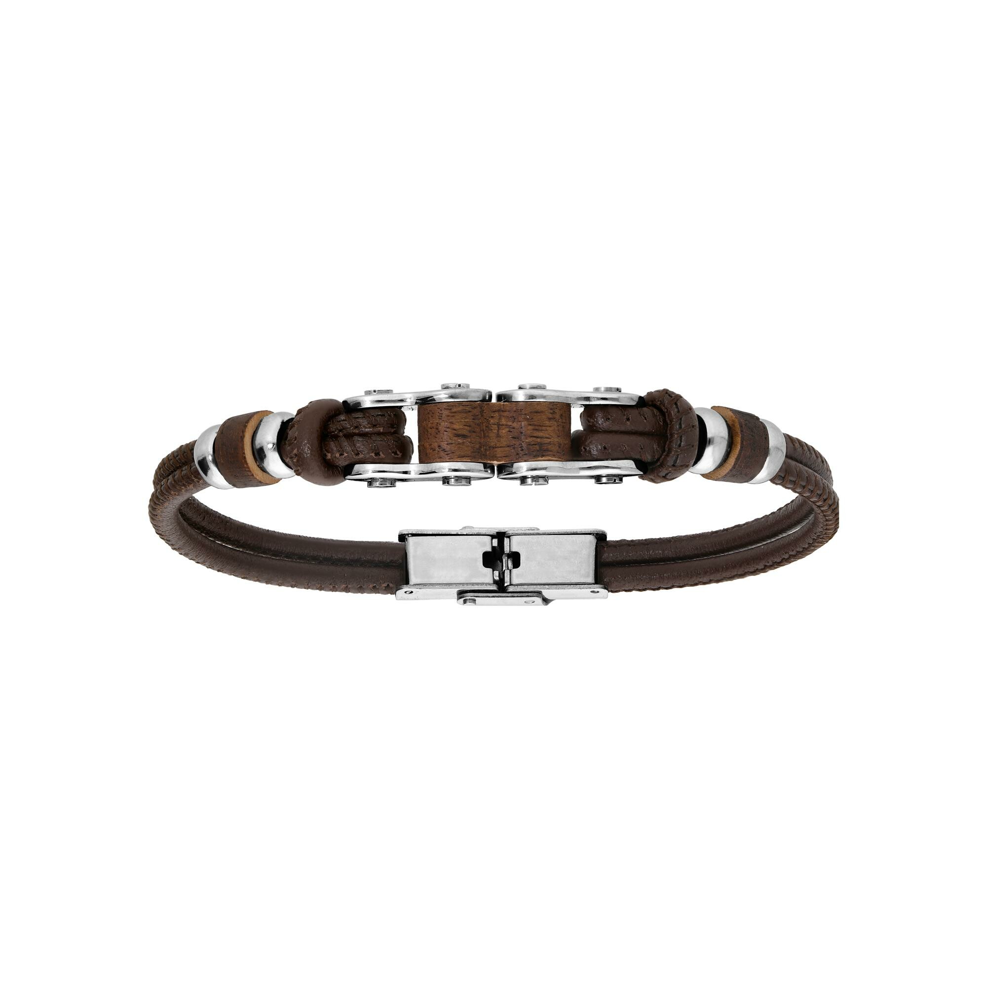 Bracelet acier cuir bovin marron et bois réglable 20cm