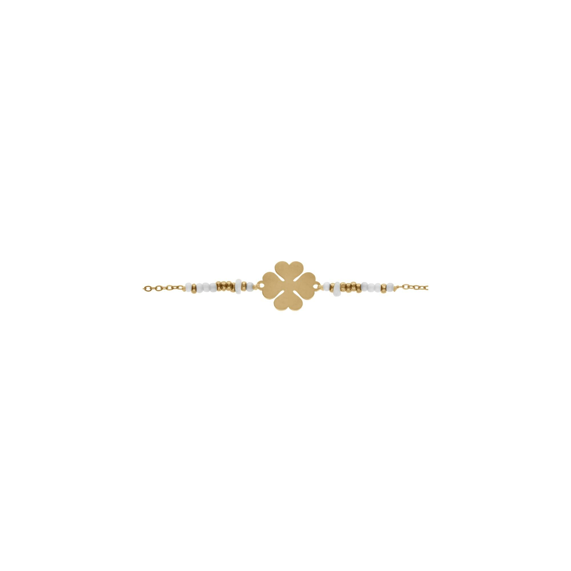 Bracelet acier pvd doré trèfle et boules blanches imitation 16+3cm