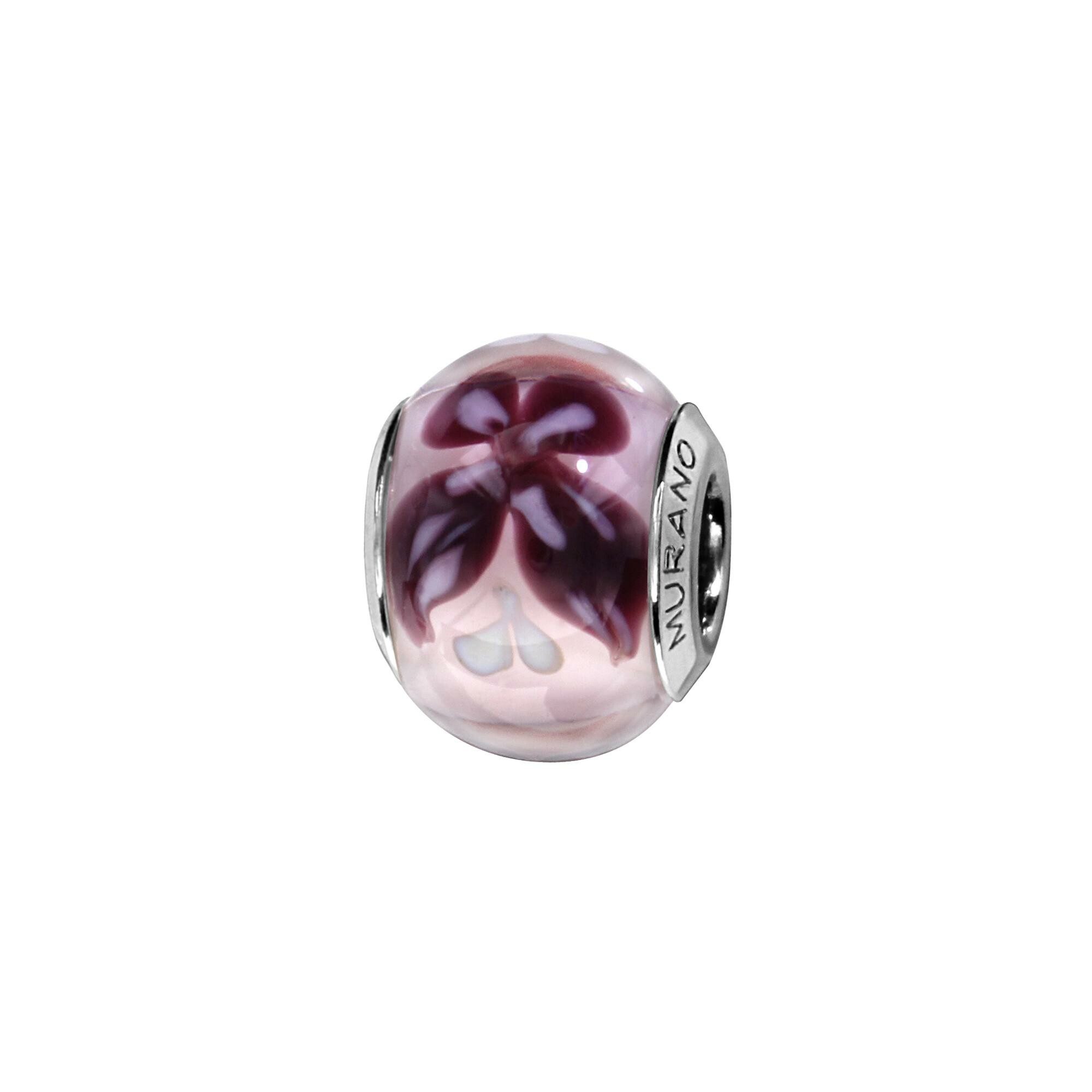 Charms coulissant argent rhodié murano véritable violet avec fleur